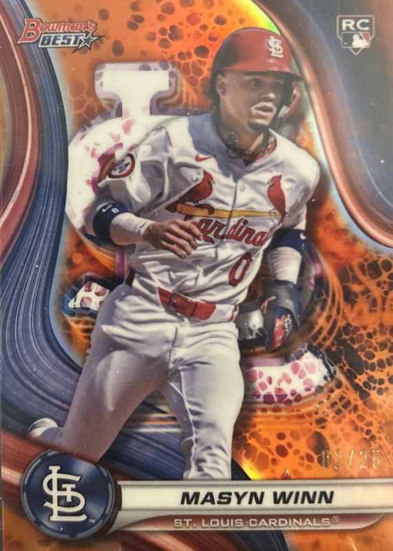 The Masyn Winn 2024 Bowman's Best #60 Orange Refractor /25 Rookie card in Raw condition has not changed in price in the last 30 days and was last sold for $35.00 .