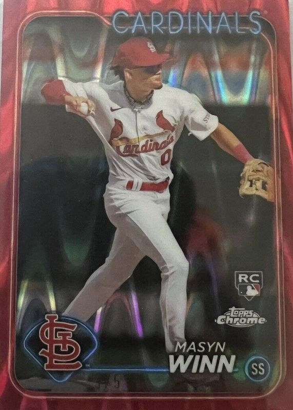 The Masyn Winn 2024 Topps Chrome #189 Red RayWave Refractor /5 Rookie card in Raw condition has not changed in price in the last 30 days and was last sold for $300.00 .