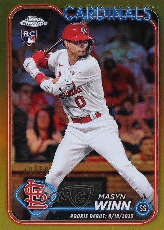 The Masyn Winn 2024 Topps Chrome Update #USC23 Rookie Debut - Gold Refractor /50 card in Raw condition has not changed in price in the last 30 days and was last sold for $40.00 .