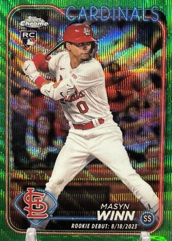 The Masyn Winn 2024 Topps Chrome Update #USC23 Rookie Debut - Green Wave Refractor /99 card in Raw condition has not changed in price in the last 30 days and was last sold for $9.50 .