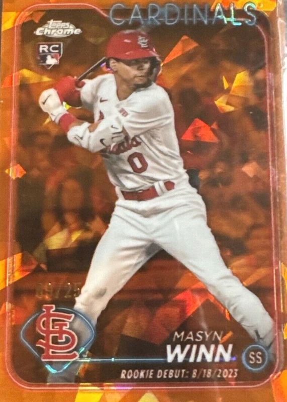 The Masyn Winn 2024 Topps Chrome Update #USC23 Rookie Debut - Orange Refractor /25 card in Raw condition has not changed in price in the last 30 days and was last sold for $80.90 .