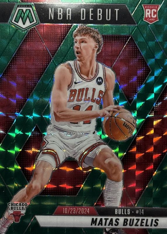 The Matas Buzelis 2024 Mosaic #257 NBA Debut - Green Rookie card in Raw condition has moved up $5.74 (+459%) in the last 30 days and was last sold for $6.99 .