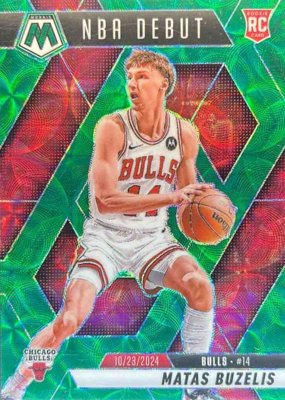 The Matas Buzelis 2024 Mosaic #257 NBA Debut - International Green /15 Rookie card in Raw condition has not changed in price in the last 30 days and was last sold for $33.00 .