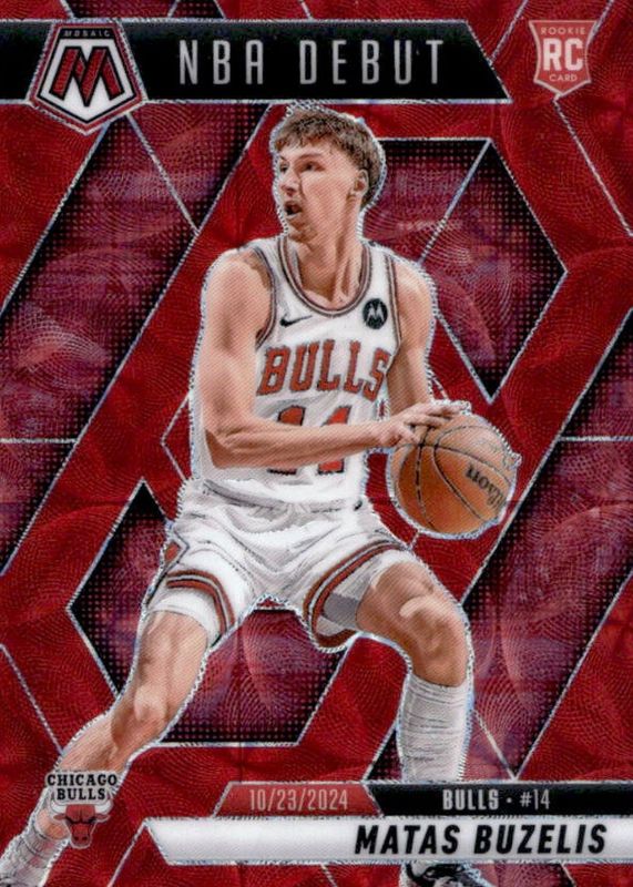 The Matas Buzelis 2024 Mosaic #257 NBA Debut - International Red /75 Rookie card in Raw condition has not changed in price in the last 30 days and was last sold for $8.50 .