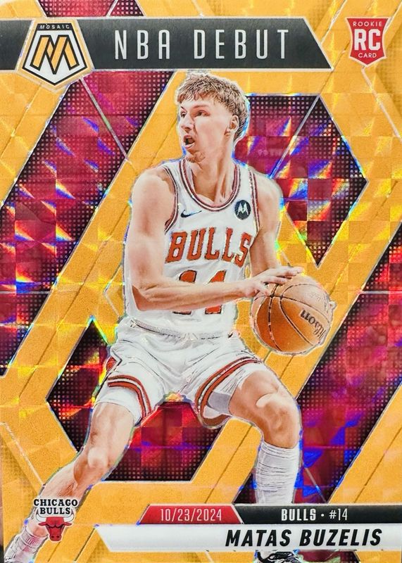 The Matas Buzelis 2024 Mosaic #257 NBA Debut - Orange Fluorescent /25 Rookie card in Raw condition has not changed in price in the last 30 days and was last sold for $55.00 .