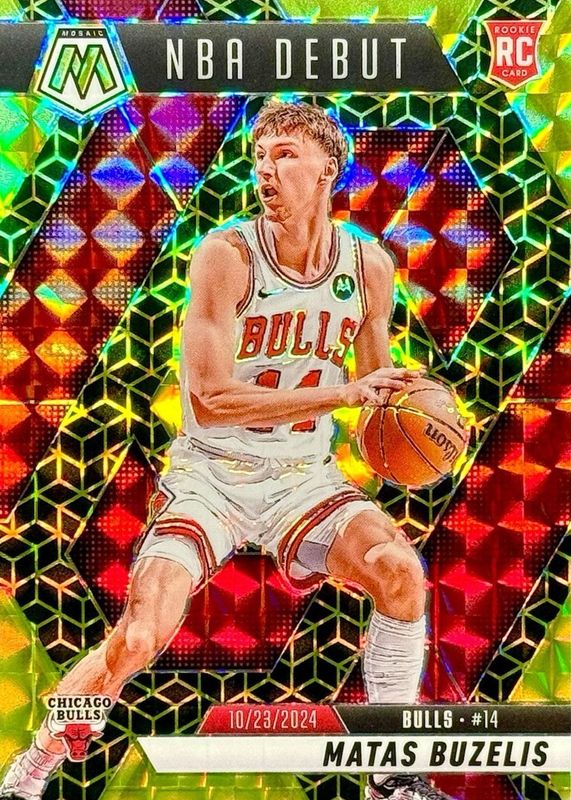 The Matas Buzelis 2024 Mosaic #257 NBA Debut - Spectris Gold FOTL /10 Rookie card in Raw condition has not changed in price in the last 30 days and was last sold for $147.50 .