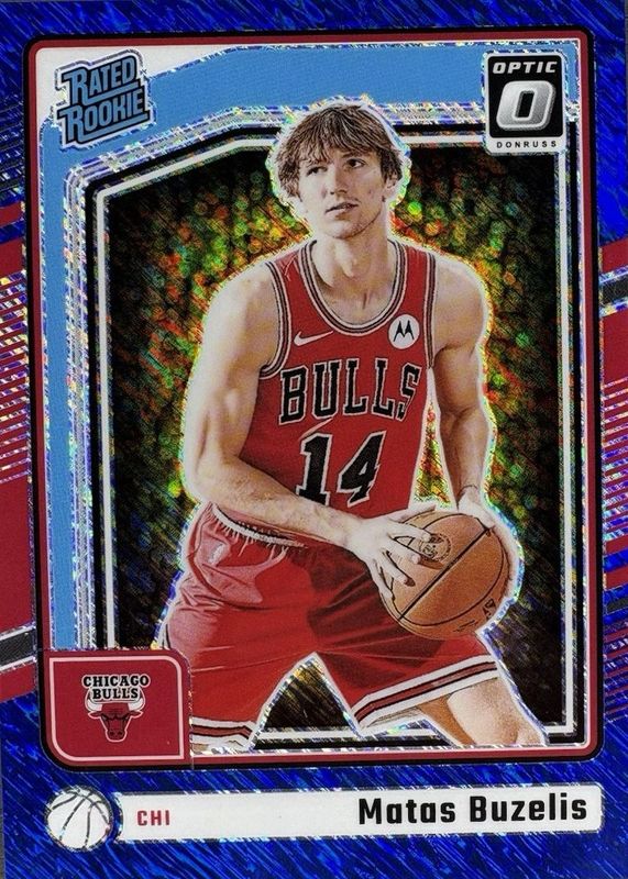 The Matas Buzelis 2024 Optic #271 Blue Shimmer /75 Rookie card in Raw condition has not changed in price in the last 30 days and was last sold for $56.00 .
