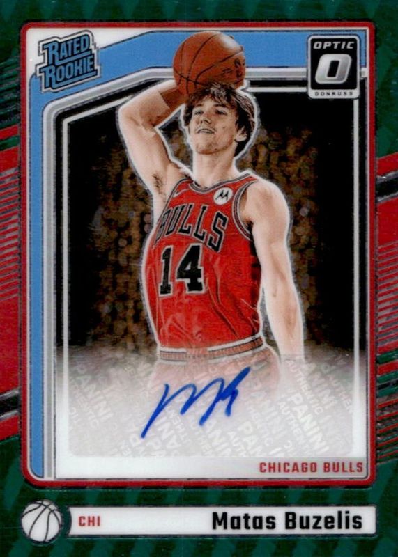 The Matas Buzelis 2024 Optic #306 Rated Rookie Signatures - FOTL Green /7 card in Raw condition has not changed in price in the last 30 days and was last sold for $848.00 .