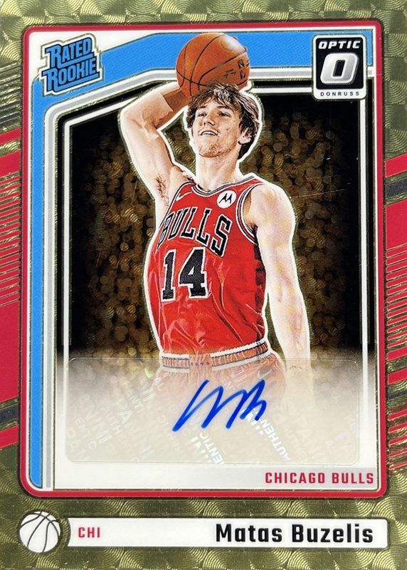 The Matas Buzelis 2024 Optic #306 Rated Rookie Signatures - Gold Vinyl /1 card in Raw condition has not changed in price in the last 30 days and was last sold for $7,521.00 .