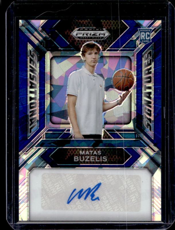 The Matas Buzelis 2024 Prizm Draft Picks #SS-MBZ Sensational Signatures - Blue Ice /75 Rookie card is 1 of 166 Matas Buzelis' card variations in the 2024 Prizm Draft Picks set being tracked by Sports Card Investor, including #67 Base, #67b Base, #67 Green, #67b Green, and #67 Green Wave.