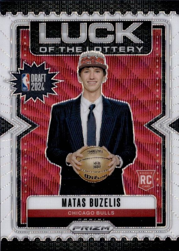 The Matas Buzelis 2024 Prizm #8 Luck of the Lottery - White Wave /20 Rookie card in Raw condition has not changed in price in the last 30 days and was last sold for $94.76 .