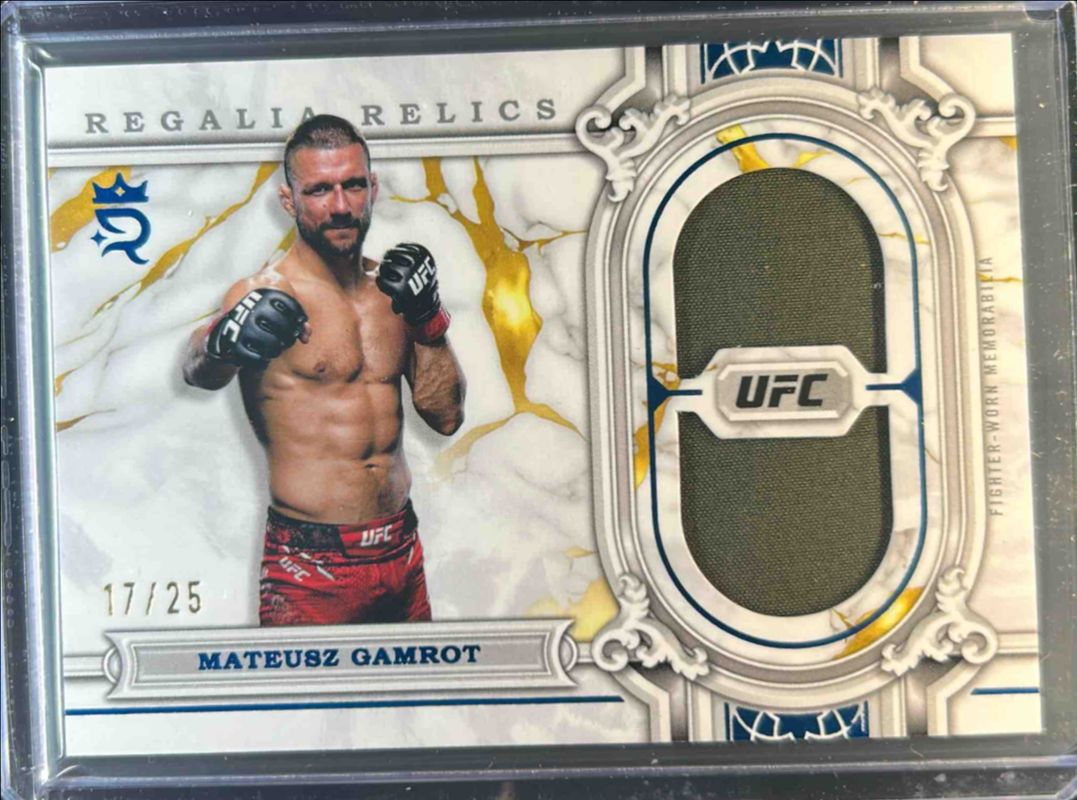 The Mateusz Gamrot 2024 Topps UFC Royalty #RAR-56 Regalia Relics - Blue /25 card is 1 of 18 Mateusz Gamrot's card variations in the 2024 Topps UFC Royalty set being tracked by Sports Card Investor, including Pursuit of Greatness Signatures /99, Regalia Relics /99, Royalty Relic Signatures /99, Autographed Jumbo Relic Booklet /25, and Pursuit of Greatness Signatures - Blue /25.