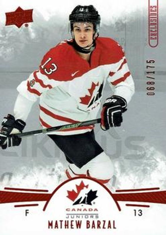 The Mathew Barzal 2016 Upper Deck Team Canada Juniors #33 Exclusives /175 Rookie card is 1 of 30 Mathew Barzal's card variations in the 2016 Upper Deck Team Canada Juniors set being tracked by Sports Card Investor, including #33 Base, #110 Base, #33 High Gloss Spectrum /25, #33 Gold /16, and #110 Gold /16.