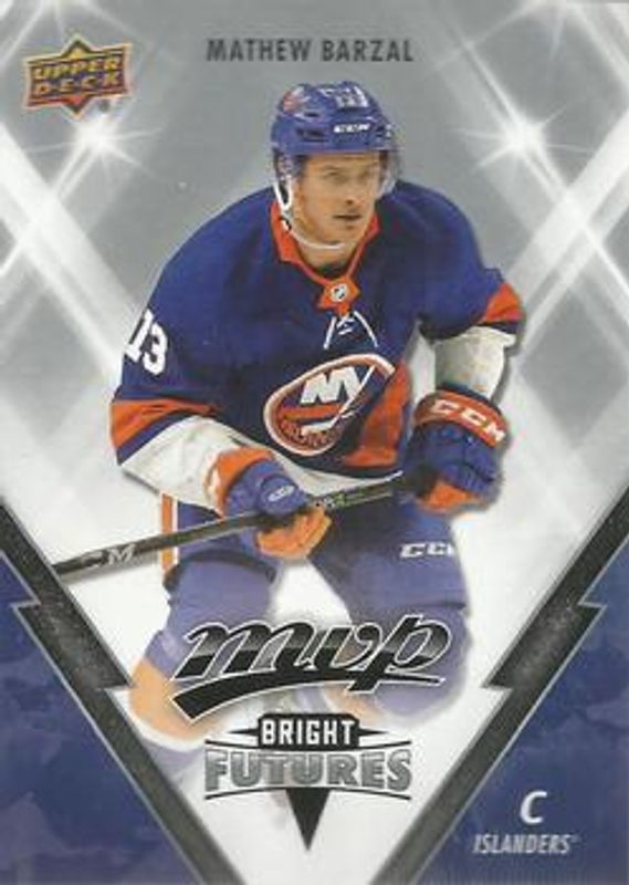 The Mathew Barzal 2018 Upper Deck MVP #BF-1 Bright Futures card is 1 of 20 Mathew Barzal's card variations in the 2018 Upper Deck MVP set being tracked by Sports Card Investor, including Base, Factory Set Blue, Green Script, Silver Script, and Gold Script /150.