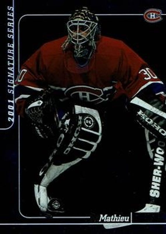 The Mathieu Garon 2000 In The Game Be a Player Signature Series #299 Sapphire /100 card is 1 of 18 Mathieu Garon's card variations in the 2000 In The Game Be a Player Signature Series set being tracked by Sports Card Investor, including Base /1000, Ruby /200, Chicago Sportsfest 2001 Bronze /10, Chicago Sportsfest 2001 Platinum /10, and Chicago Sportsfest 2001 Ruby /10.