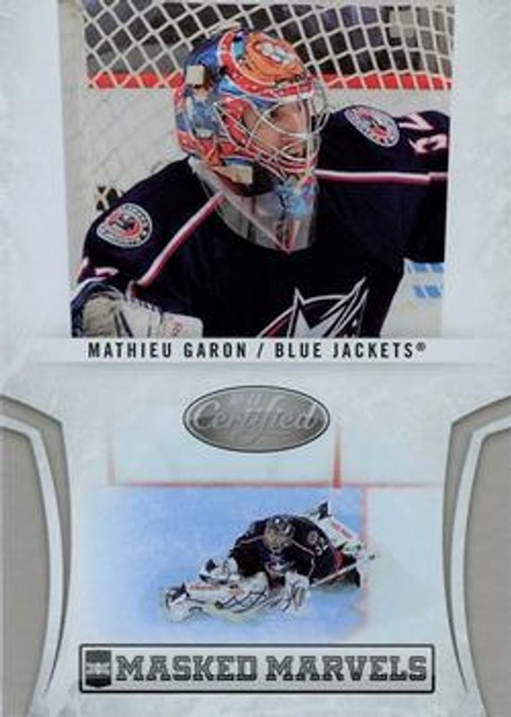 The Mathieu Garon 2010 Certified #18 Masked Marvels /500 card is 1 of 11 Mathieu Garon's card variations in the 2010 Certified set being tracked by Sports Card Investor, including Expo 10 Promos: Masked Marvels /5, Masked Marvels - Mirror Red /250, Masked Marvels - Mirror Blue /100, Masked Marvels Materials /99, and Masked Marvels Materials Autographs /25.