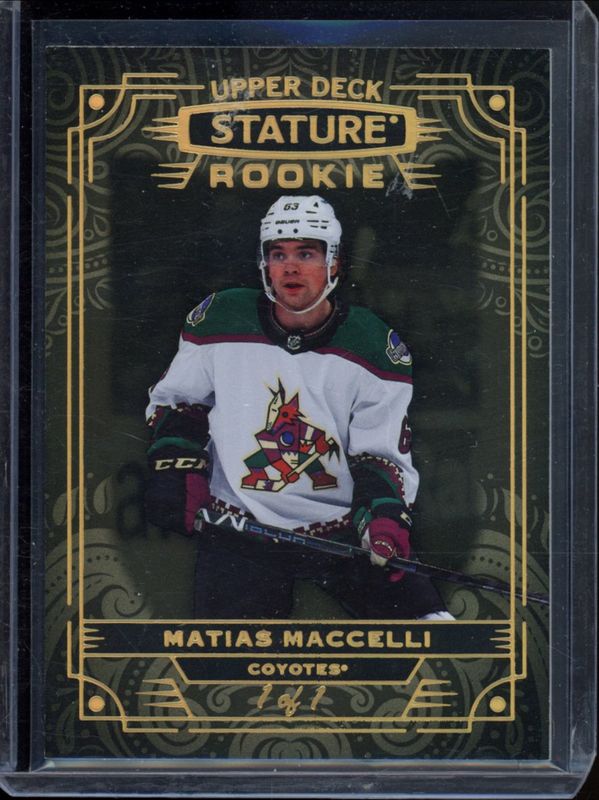 The Matias Maccelli 2022 Upper Deck Stature #114 Autographs - Black /1 Rookie card is 1 of 48 Matias Maccelli's card variations in the 2022 Upper Deck Stature set being tracked by Sports Card Investor, including Base /399, Green /99, Photo Variant /99, Red /75, and Photo Variant Green /66.
