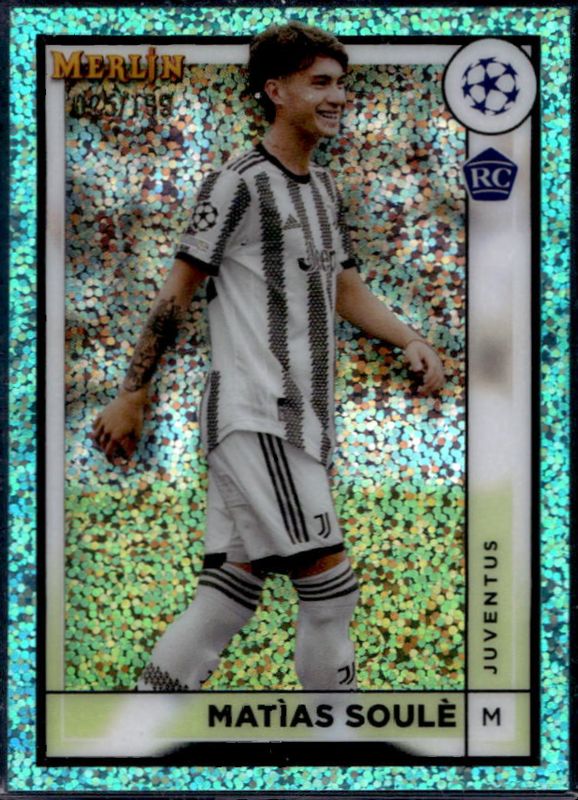 The Matias Soule 2022 Topps Merlin Chrome UEFA Club Competitions #80 Aqua Speckle Refractor /199 Rookie card is 1 of 32 Matias Soule's card variations in the 2022 Topps Merlin Chrome UEFA Club Competitions set being tracked by Sports Card Investor, including Base, Aqua Prism Refractor, Refractor, Vintage Merlin Refractor, and Neon Green Shimmer Refractor /350.