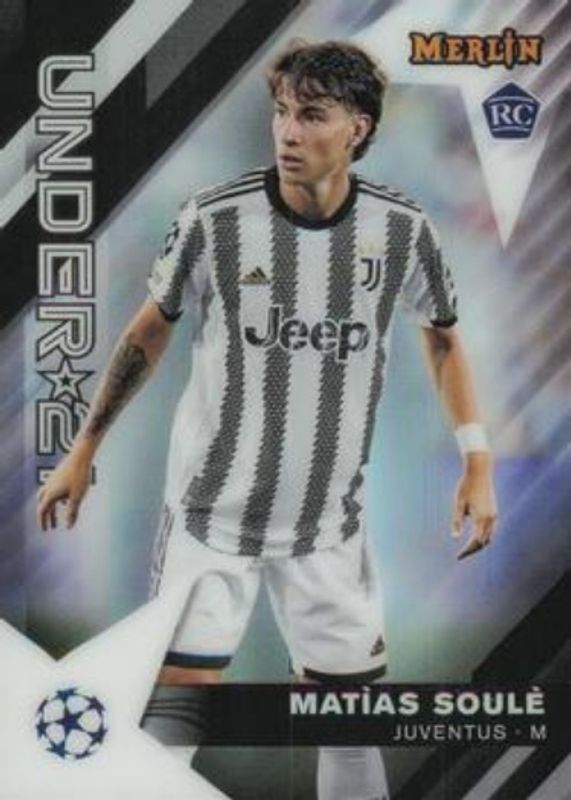The Matias Soule 2022 Topps Merlin Chrome UEFA Club Competitions #U21-19 U21 Stars Rookie card is 1 of 32 Matias Soule's card variations in the 2022 Topps Merlin Chrome UEFA Club Competitions set being tracked by Sports Card Investor, including Base, Aqua Prism Refractor, Refractor, Vintage Merlin Refractor, and Neon Green Shimmer Refractor /350.