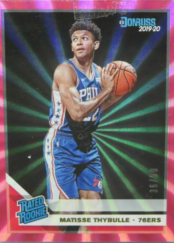 The Matisse Thybulle 2019 Donruss #219 Pink Laser /50 Rookie card in Raw condition has not changed in price in the last 30 days and was last sold for $10.50 .