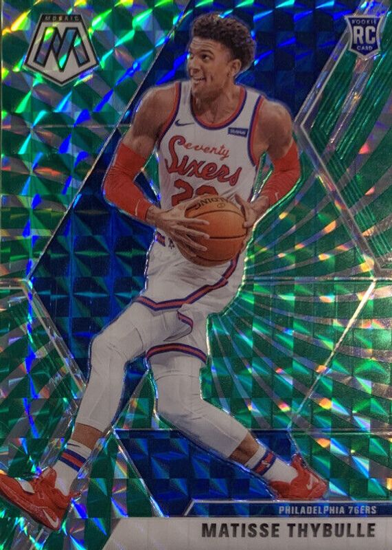 The Matisse Thybulle 2019 Mosaic #245 FOTL Green Swirl /10 Rookie card in Raw condition has not changed in price in the last 30 days and was last sold for $40.99 .