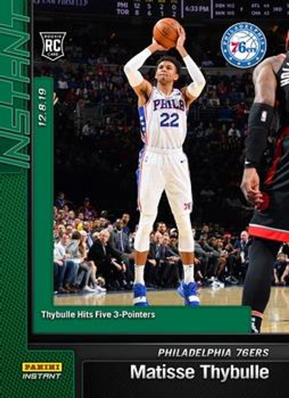 The Matisse Thybulle 2019 Panini Instant #45 Green /10 Rookie card is 1 of 7 Matisse Thybulle's card variations in the 2019 Panini Instant set being tracked by Sports Card Investor, including Base, Yellow /88, Orange /25, Green Dragon /8, and Black /1.