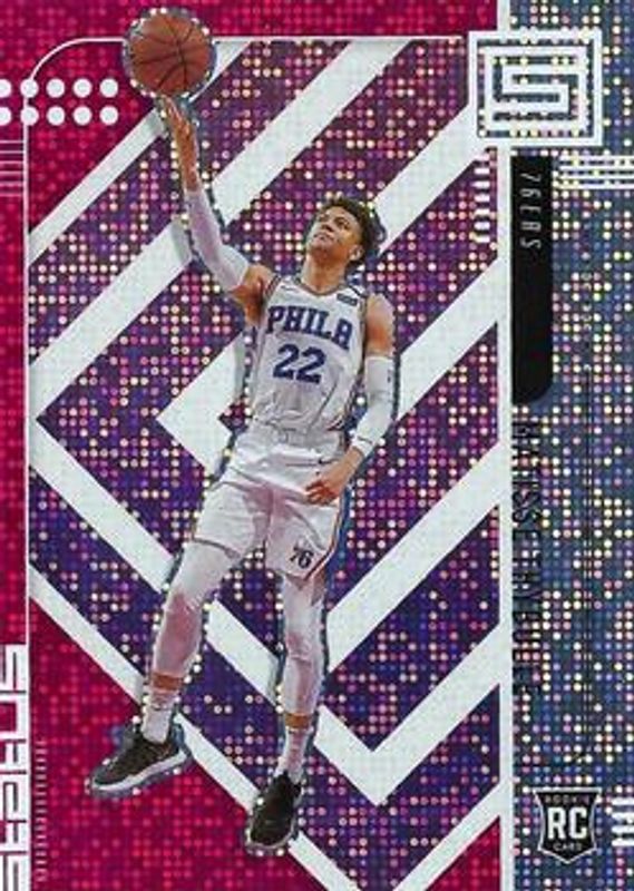 The Matisse Thybulle 2019 Status #52 Red Rookie card is 1 of 14 Matisse Thybulle's card variations in the 2019 Status set being tracked by Sports Card Investor, including Base, Blue, White Diamonds /125, Green Escher Squares /49, and Gold Fireworks /10.