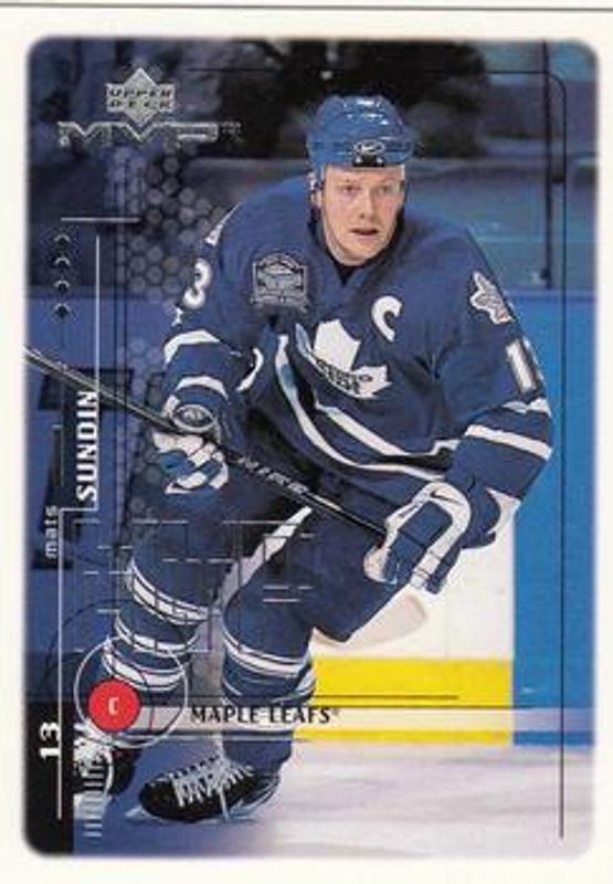 The Mats Sundin 1998 Upper Deck MVP #195 Base card is 1 of 5 Mats Sundin's card variations in the 1998 Upper Deck MVP set being tracked by Sports Card Investor, including Silver Script, Gold Script /100, Super Script /25, and Power Game.