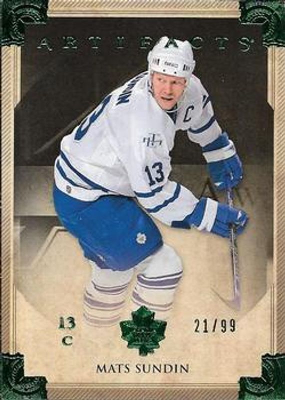 The Mats Sundin 2013 Upper Deck Artifacts #56 Emerald /99 card is 1 of 19 Mats Sundin's card variations in the 2013 Upper Deck Artifacts set being tracked by Sports Card Investor, including Base /899, Ruby /299, Sapphire /85, Spectrum /25, and Black /5.