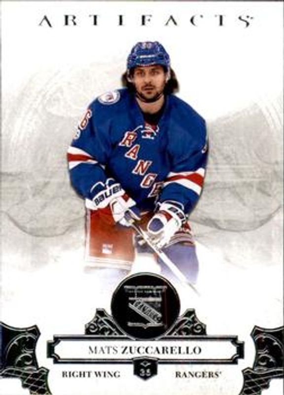 The Mats Zuccarello 2017 Upper Deck Artifacts #52 Base /799 card is 1 of 17 Mats Zuccarello's card variations in the 2017 Upper Deck Artifacts set being tracked by Sports Card Investor, including Materials Silver /125, Auto Material Silver /99, Emerald /99, Orange /55, and Auto Material Emerald /25.