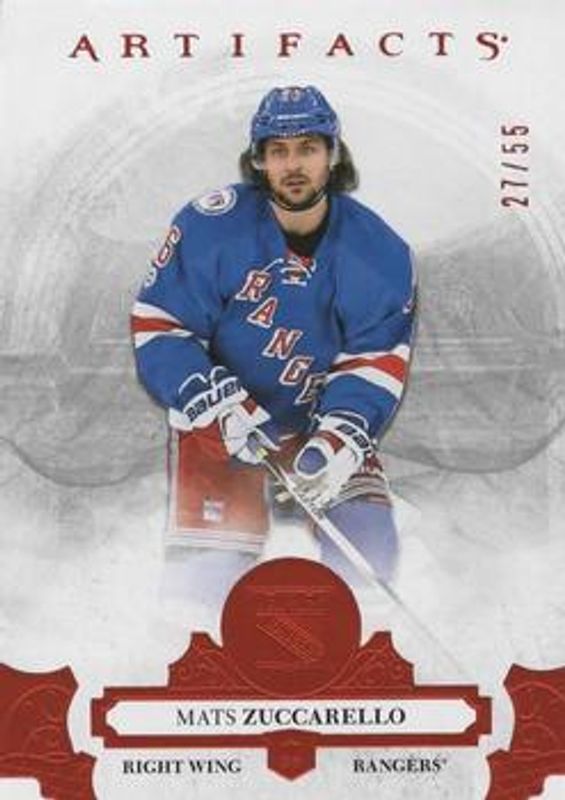 The Mats Zuccarello 2017 Upper Deck Artifacts #52 Orange /55 card is 1 of 17 Mats Zuccarello's card variations in the 2017 Upper Deck Artifacts set being tracked by Sports Card Investor, including Base /799, Materials Silver /125, Auto Material Silver /99, Emerald /99, and Auto Material Emerald /25.