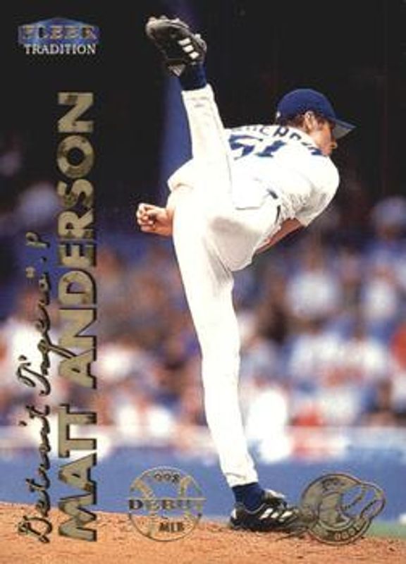 The Matt Anderson 1999 Fleer Tradition #321 Millennium Rookie card is 1 of 5 Matt Anderson's card variations in the 1999 Fleer Tradition set being tracked by Sports Card Investor, including Base, Warning Track Collection, Starting 9 /9, and Rookie Flashback.