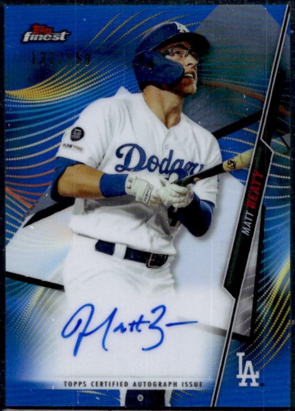 The Matt Beaty 2020 Topps Finest #FA-MBE Autographs - Blue Refractor /150 card is 1 of 18 Matt Beaty's card variations in the 2020 Topps Finest set being tracked by Sports Card Investor, including 1998 The Man, Autographs, 1998 The Man Autographs /99, Autographs - Green Refractor /99, and Autographs - Green Wave Refractor /99.