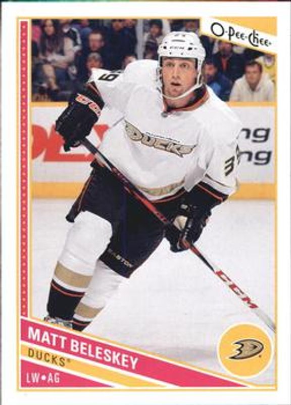 The Matt Beleskey 2013 O-Pee-Chee #277 Base card is 1 of 6 Matt Beleskey's card variations in the 2013 O-Pee-Chee set being tracked by Sports Card Investor, including Rainbow, Red, Retro, Retro Blank Back, and Black Rainbow /100.