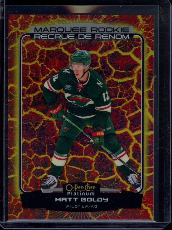 The Matt Boldy 2022 O-Pee-Chee Platinum #202 Hot Magma /499 Rookie card is 1 of 42 Matt Boldy's card variations in the 2022 O-Pee-Chee Platinum set being tracked by Sports Card Investor, including Base, Matte Pink, Neon Yellow Surge, Rainbow, and Sunset.