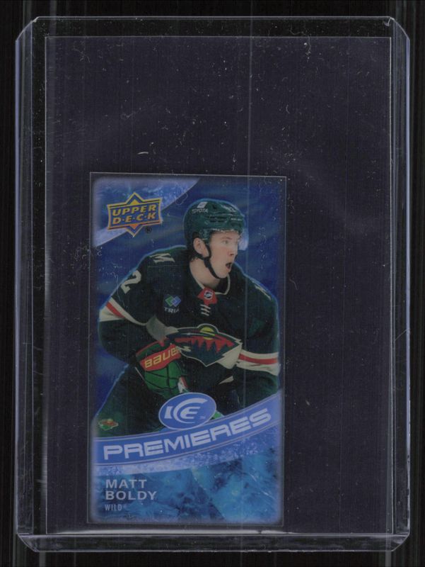 The Matt Boldy 2022 Upper Deck Ice #MI-13 Ice Premieres Minis Rookie card is 1 of 53 Matt Boldy's card variations in the 2022 Upper Deck Ice set being tracked by Sports Card Investor, including #246 Base /1299, #106 Base /1299, #106 Autographs White Snowflake, #106 Gold, and #106 Green.