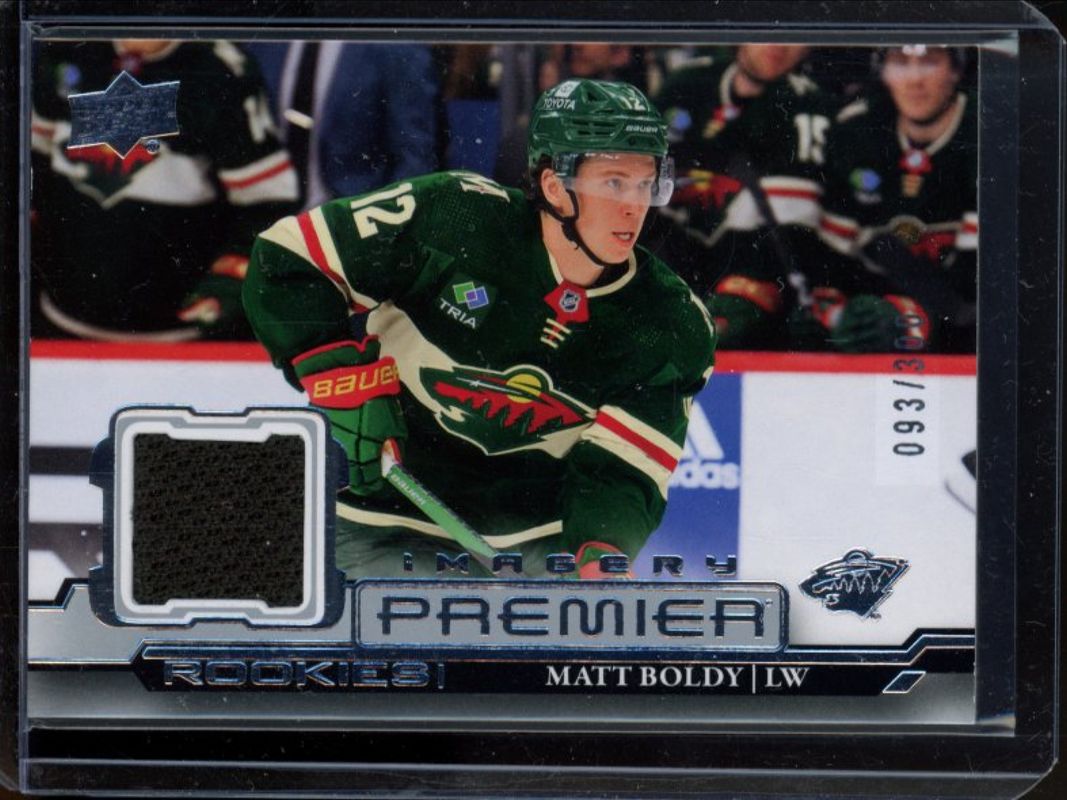 The Matt Boldy 2022 Upper Deck Premier #PDJR-BO Premier Dynamic Imagery Rookies - Jersey /300 card is 1 of 43 Matt Boldy's card variations in the 2022 Upper Deck Premier set being tracked by Sports Card Investor, including Base /399, Autographs, Jersey, Rookies Bronze /199, and Gold /65.