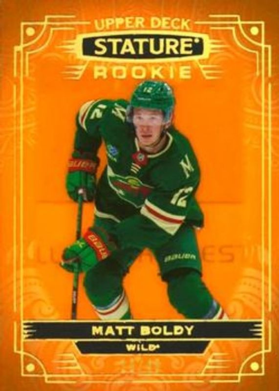 The Matt Boldy 2022 Upper Deck Stature #101 Orange /45 Rookie card is 1 of 48 Matt Boldy's card variations in the 2022 Upper Deck Stature set being tracked by Sports Card Investor, including Base /399, Green /99, Photo Variant /99, Red /75, and Photo Variant Green /66.