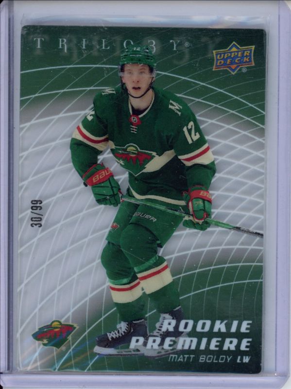 The Matt Boldy 2022 Upper Deck Trilogy #05-MB 2005 Rookie Premieres Tribute /99 card is 1 of 48 Matt Boldy's card variations in the 2022 Upper Deck Trilogy set being tracked by Sports Card Investor, including #248 Base /699, #148 Base /699, #198 Base /699, #198 Black Foil Memorabilia /499, and #248 Black Foil Memorabilia /499.