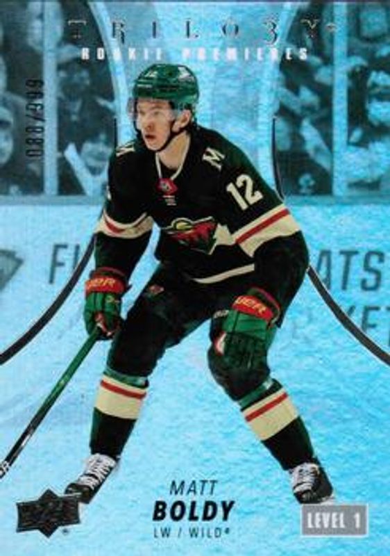 The Matt Boldy 2022 Upper Deck Trilogy #148 Base /699 Rookie card is 1 of 48 Matt Boldy's card variations in the 2022 Upper Deck Trilogy set being tracked by Sports Card Investor, including #248 Base /699, #198 Base /699, #198 Black Foil Memorabilia /499, #248 Black Foil Memorabilia /499, and #148 Black Foil Memorabilia /499.