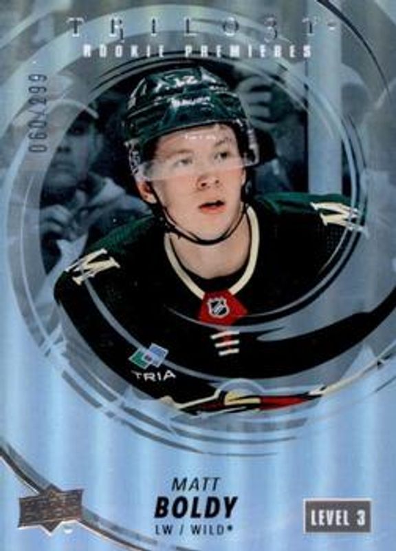 The Matt Boldy 2022 Upper Deck Trilogy #248 Base /699 Rookie card is 1 of 48 Matt Boldy's card variations in the 2022 Upper Deck Trilogy set being tracked by Sports Card Investor, including #148 Base /699, #198 Base /699, #198 Black Foil Memorabilia /499, #248 Black Foil Memorabilia /499, and #148 Black Foil Memorabilia /499.