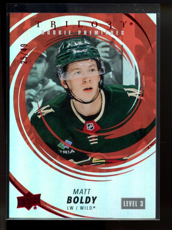The Matt Boldy 2022 Upper Deck Trilogy #248 Red /49 Rookie card is 1 of 48 Matt Boldy's card variations in the 2022 Upper Deck Trilogy set being tracked by Sports Card Investor, including #248 Base /699, #148 Base /699, #198 Base /699, #198 Black Foil Memorabilia /499, and #248 Black Foil Memorabilia /499.
