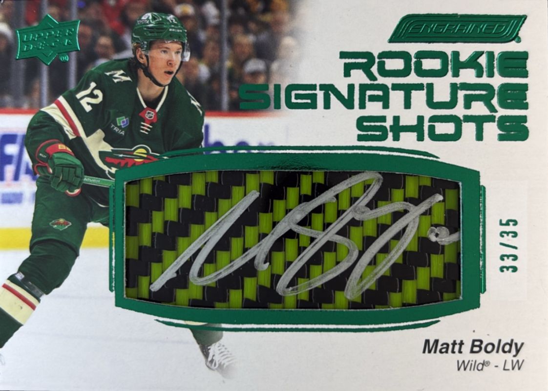 The Matt Boldy 2023 Upper Deck Engrained #RSS-MB 2022 Upper Deck Engrained Update: Rookie Signatures Shots Green Stick /35 card is 1 of 9 Matt Boldy's card variations in the 2023 Upper Deck Engrained set being tracked by Sports Card Investor, including Oak /399, Ebony /49, Memorabilia Ebony /15, Mahogany /10, and Rosewood /1.