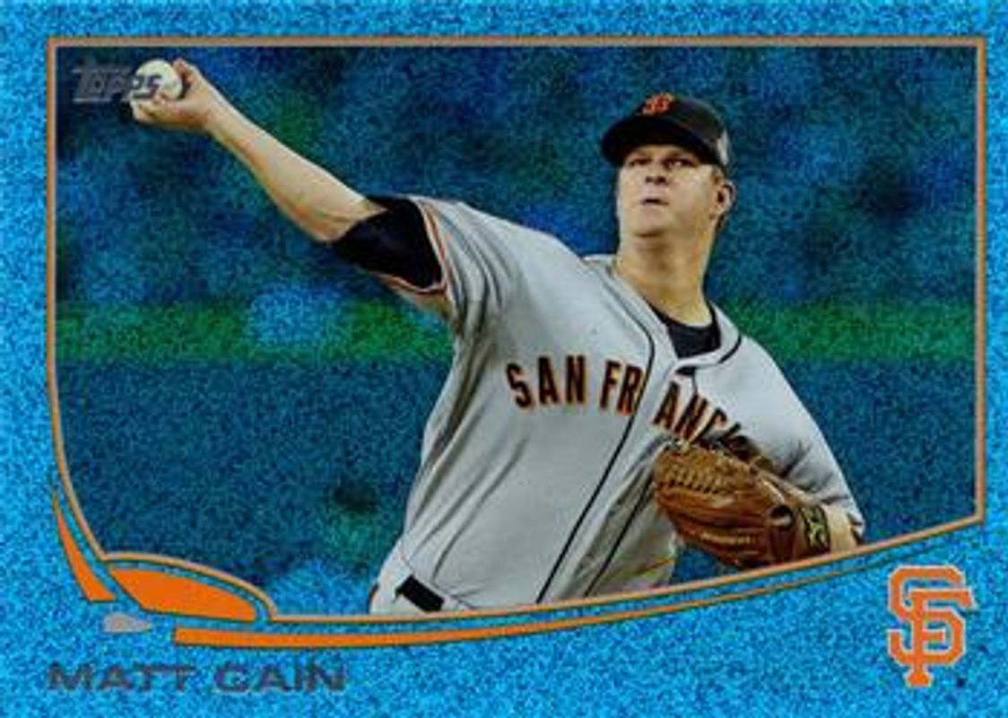 The Matt Cain 2013 Topps #587 Silver Slate Blue Sparkle card is 1 of 35 Matt Cain's card variations in the 2013 Topps set being tracked by Sports Card Investor, including 1972 Topps Minis, Base, Chasing History, Chasing History - Gold Foil, and Chasing History Relics.