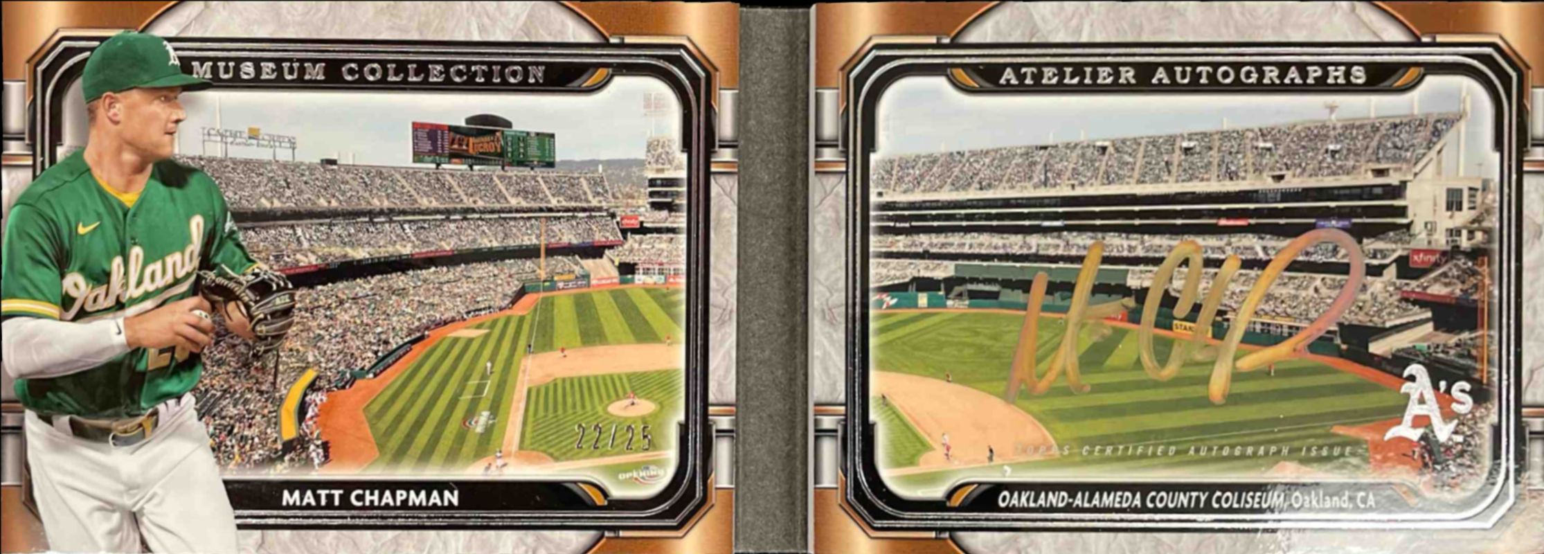 The Matt Chapman 2021 Topps Museum Collection #AABC-MC Atelier Autographed Book /25 card is 1 of 23 Matt Chapman's card variations in the 2021 Topps Museum Collection set being tracked by Sports Card Investor, including Base, Copper, Sapphire /150, Amethyst /99, and Ruby /50.