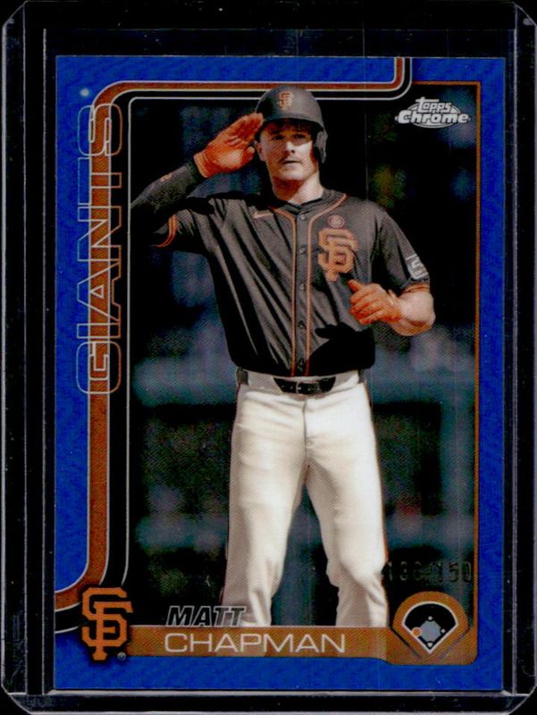The Matt Chapman 2025 Topps Chrome #148 Blue Refractor /150 card is 1 of 52 Matt Chapman's card variations in the 2025 Topps Chrome set being tracked by Sports Card Investor, including Base, Geometric Refractor, Lightboard Logo Variation, Negative Refractor, and Prism Refractor.