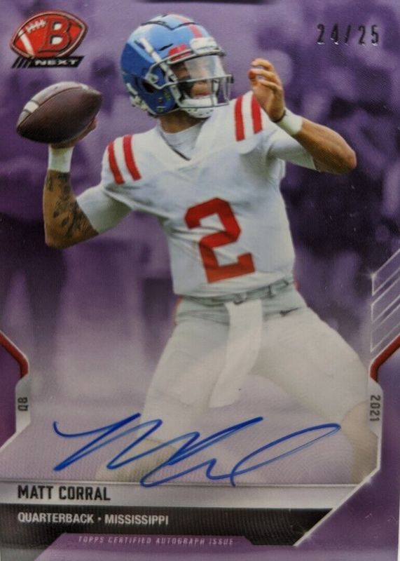 The Matt Corral 2021 Bowman Next #5 Autographs - Purple /25 card in Raw condition has not changed in price in the last 30 days and was last sold for $18.43 .