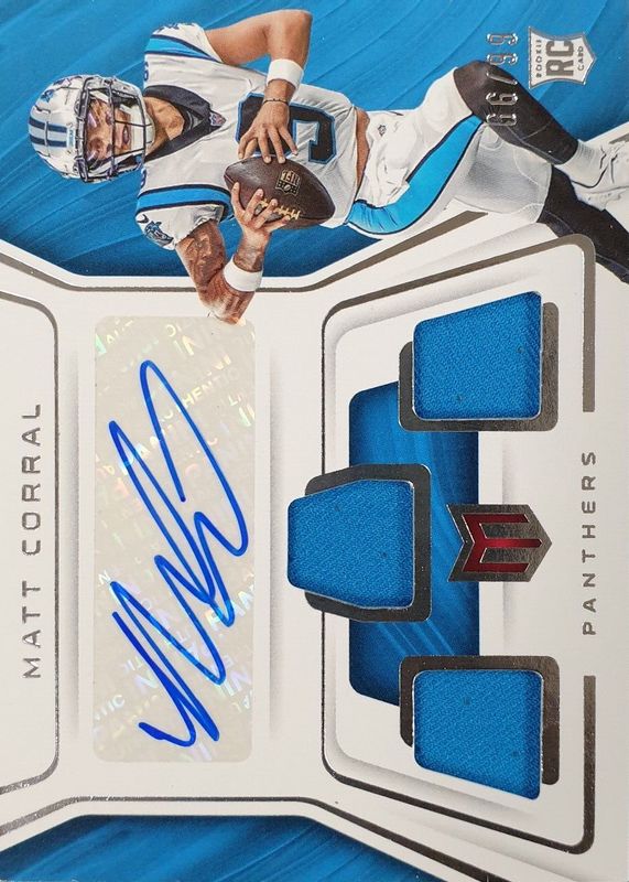 The Matt Corral 2022 Chronicles #MJA-MAC Momentum Triple Jersey Autographs (/99) Rookie card in Raw condition has not changed in price in the last 30 days and was last sold for $10.00 .