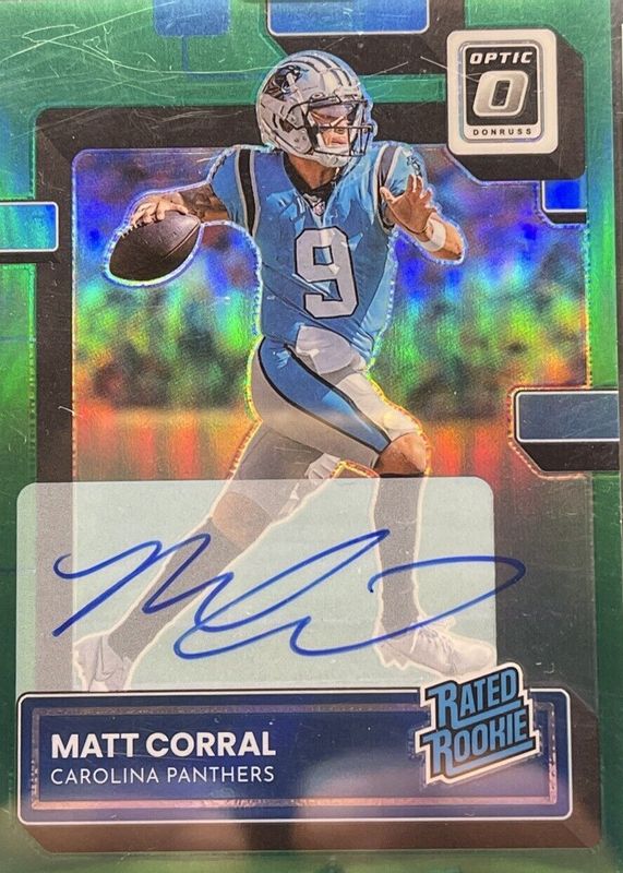 The Matt Corral 2022 Optic #204 Rated Rookie Autographs - Green /5 card in Raw condition has not changed in price in the last 30 days and was last sold for $111.11 .