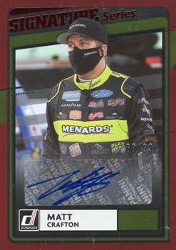The Matt Crafton 2021 Donruss NASCAR #SS-MC Signatures Series - Red /99 card is 1 of 4 Matt Crafton's card variations in the 2021 Donruss NASCAR set being tracked by Sports Card Investor, including Signatures Series, Signatures Series - Holo Gold /25, and Signatures Series Holo - Black /1.